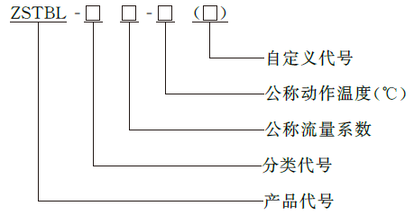 示例:ZSTBL-XQ80-68℃F3 表示 F3 型,下垂安装,玻璃球型,公称流量系数为 80,公称动作温度为 68℃,玻璃分隔用洒水喷头