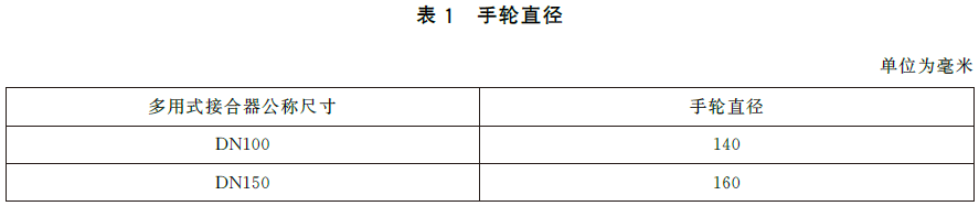 多用式接合器的手轮型式应符合 JB/T7273.3 的规定。手轮直径应符合表 1 的规定。其尺寸的公差应符合 GB/T1804-2000 中 v 级的规定。手轮轮缘上应有永久性的表示开关方向的箭头和字样。