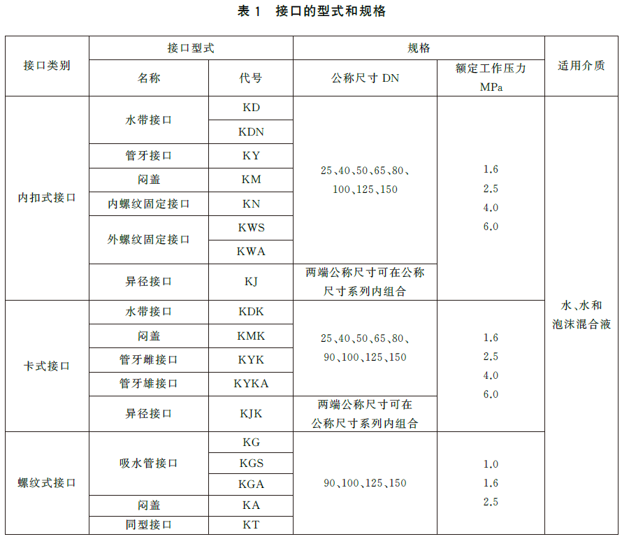 4.1.1.1 接口按其内外接口相连接的方式不同可分为内扣式接口、卡式接口和螺纹式接口。