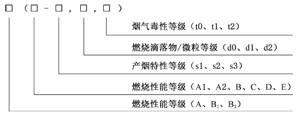 示例 2:B1 (B-s1,d0,t1) 表示材料或制品属于 B1级材料,燃烧性能等级为 B1(B) 级,产烟特性等级为 s1 级,燃烧滴落物 / 微粒等级为 d0 级,烟气毒性等级为 t1 级。