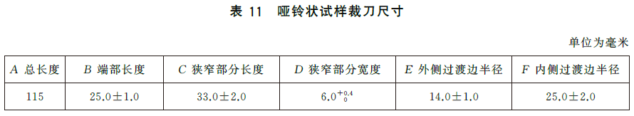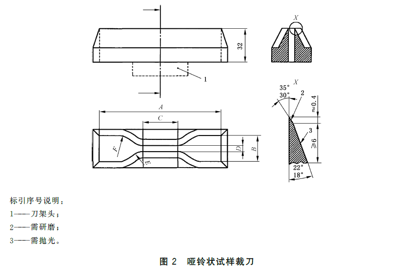 利用裁刀制备哑铃状试样 3 个,试样如图 1 所示,试验区域长度为 25.0mm±0.5mm,裁刀如图 2 所示。